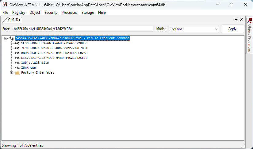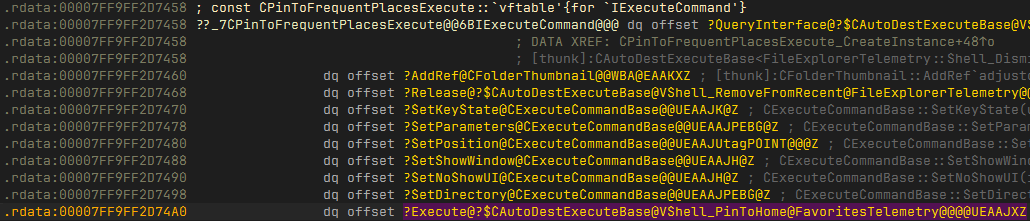 The COM class implements these interfaces and is a normal IExecuteCommand-based command. Based on the CLSID, the coclass is likely named PinToFrequent. I searched for it in IDA Pro's Names tab.