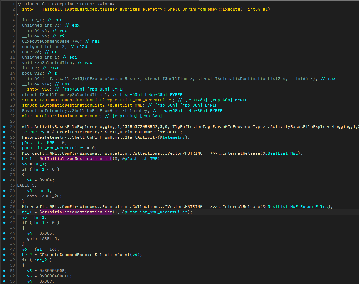 struct CAutoDestExecuteBase *this)Let's look at the pseudocode. The method calls GetInitializedDestinationList with different first parameters (0 and 1). 0 queries the automatic destinations file for Microsoft.Windows.Explorer, while 1 queries Microsoft.Windows.Explorer_RecentFiles. I renamed the local variables in the second parameter for clarity.