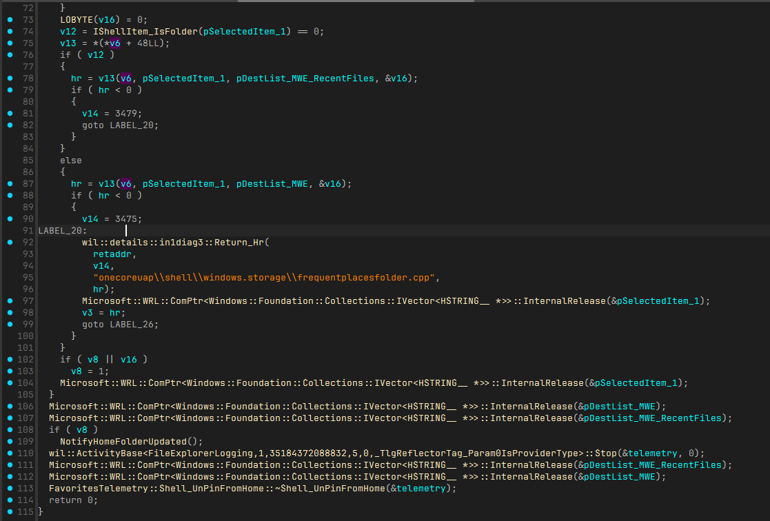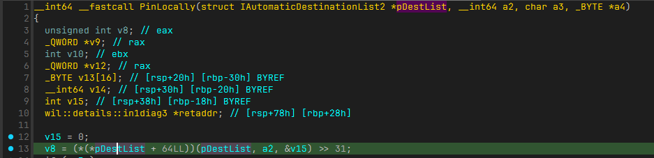 00007ffe`50bd29d6 4c8b5130 mov r10,qword ptr [rcx+30h] ds:00007ffe`50c30d90={windows_storage!CPinToFrequentPlacesExecute::ProcessItem (00007ffe`50bd8ee0)}As you can see, v6 is the vftable of CPinToFrequentPlacesExecute, and v13 is CPinToFrequentPlacesExecute::ProcessItem.