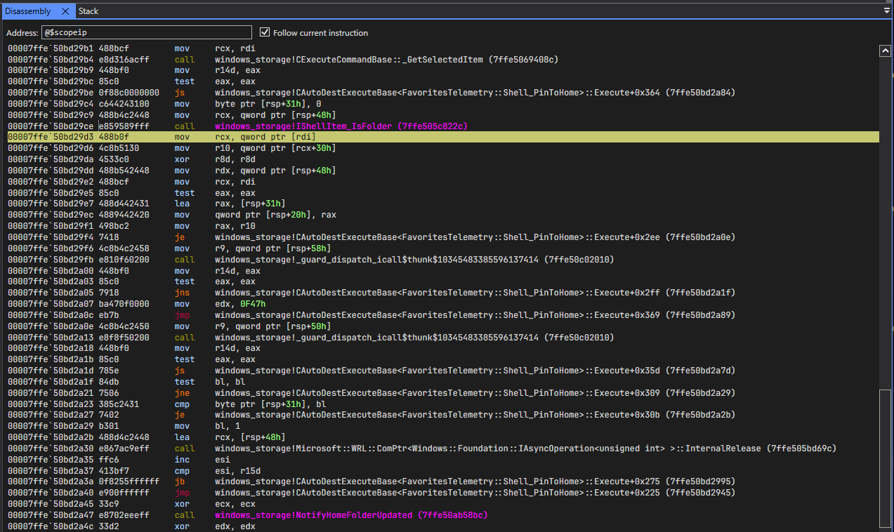 00007ffe`50bd2720 windows_storage!CAutoDestExecuteBase<FavoritesTelemetry::Shell_PinToHome>::Execute (public: virtual long __cdecl CAutoDestExecuteBase<class FavoritesTelemetry::Shell_PinToHome>::Execute(void))We found the complete signature and load address. Let's set a breakpoint here and continue.