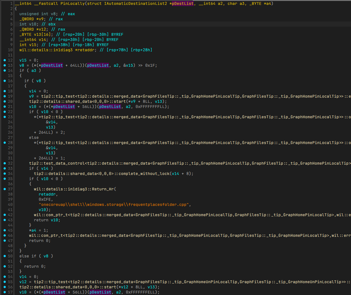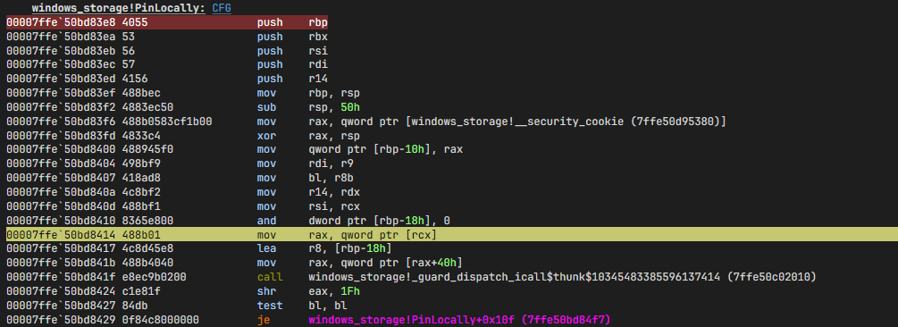 00007ffe`50bd841b 488b4040 mov rax,qword ptr [rax+40h] ds:00007ffe`50c292c8={windows_storage!CAutomaticDestinationList::IsPinned (00007ffe`50ac5fa0)}This is the IsPinned method of CAutomaticDestinationList. PinLocally first checks if the item is pinned, then pins it. Let's find that too.